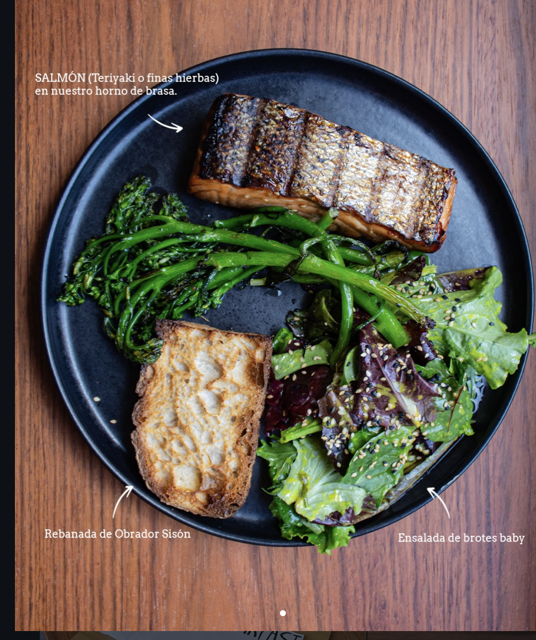 Salmón teriyaki o finas hierbas en nuestro horno de brasa, acompañado de ensalada de brotes baby, rebanada de obrador y side a escoger.